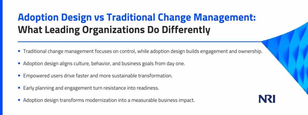 In today’s rapidly evolving technology landscape, success depends on more than just managing resistance. The real goal is to design for adoption. IT leaders who make this shift position their organizations to thrive in a constantly changing environment and turn transformation into a lasting competitive advantage. Adoption design creates change that endures, inspires, and delivers measurable results.NRI helps organizations embed adoption design into their digital transformation strategies. With global experience, proven expertise, and a focus on delivering practical results, we partner with clients to achieve transformation that is both sustainable and strategic. Contact us today to learn how our playbooks can help your organization turn change into an opportunity for growth.