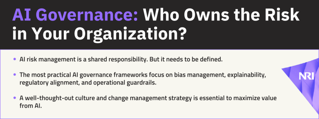 AI governance is more than a policy or a framework. It’s enterprise risk management for the next decade. The organizations that define ownership now won’t just reduce risk, they’ll accelerate innovation. They’ll build trust with regulators and customers. And ultimately, they’ll unlock far more business value than those who treat governance as an afterthought.
