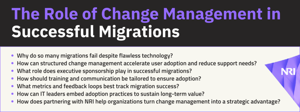 With NRI as your partner, your migration becomes more than a system upgrade. It becomes a strategic initiative that engages users, reduces help desk demand, and positions IT as a key contributor to business outcomes.