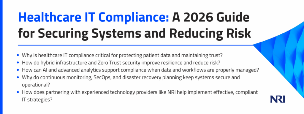 Book a strategy session with NRI specialists to discuss healthcare IT compliance solutions tailored to your organization’s needs and risk profile.