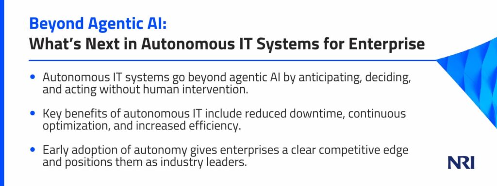 Leaders who move early will shape how autonomy works within their organization, rather than being forced to catch up later. With NRI by your side, you can adopt autonomous capabilities confidently, measure their impact, and grow at a pace that fits your business. Connect with our team to start planning your path toward a more reliable, efficient, and future-ready IT model.
