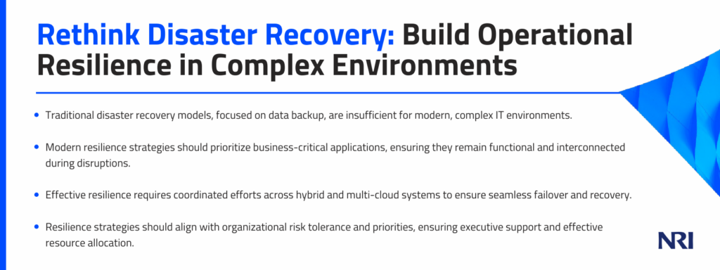 Given the limitations of traditional disaster recovery models, organizations must shift their focus from recovery planning to operational resilience. Operational resilience encompasses not only data recovery but also the seamless functioning of applications and business processes. By adopting a resilience-focused approach, organizations can better prepare for and respond to the complexities of modern IT environments.